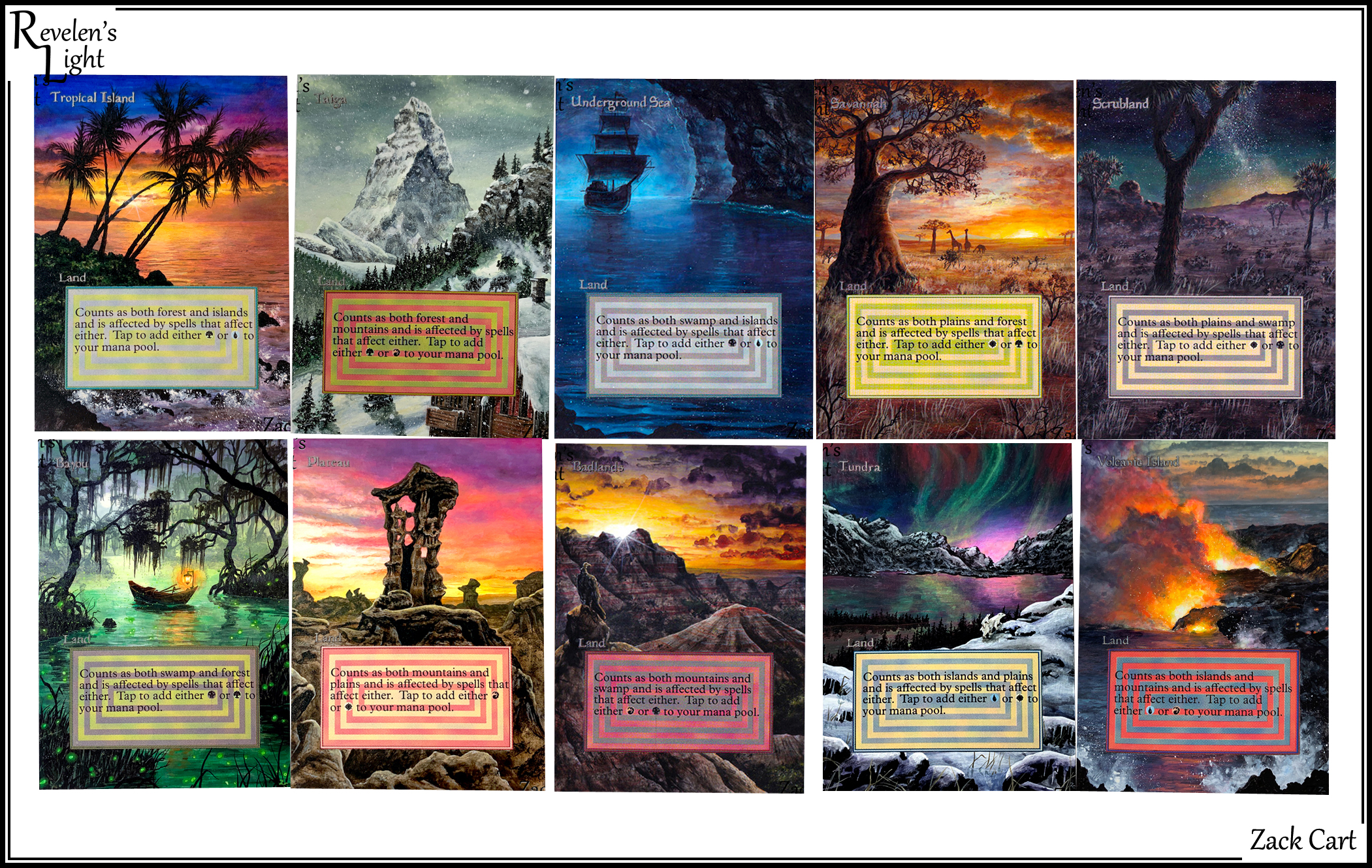 This was a great collection of altered art dual lands to work on over the past year. Taiga is represented by the Matterhorn, Scrubland by Joshua Tree National Park, Plateau is the Alien Throne, Badlands is Badlands National Park, and Volcanic Island is Volcanoes National Park. The others are not tied to specific places, but rather a location-ambiguous Tropical Island, a cavernous Underground Sea, a Savannah, an eerie green Bayou, and a polar bear duo in the Tundra. All cards hand-painted in acrylics.