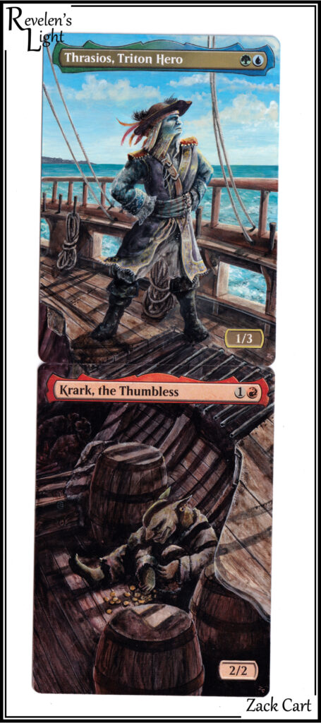 My first ever vertical diptych alter. This was my solution to the problem of a pirate alter with Thrasios in bright, noble blues, and Krark in darker, redder shadows, but in a single image on the same ship.