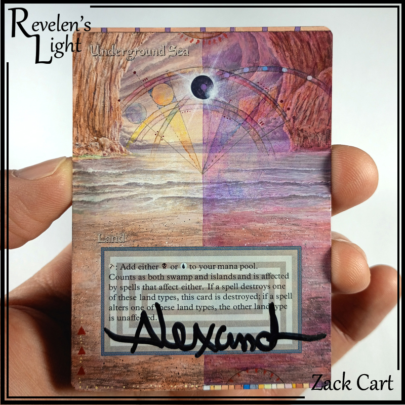 A Guru Basic Land styled overlay painted on the Magic: the Gathering card, the Dual Land Underground Sea, with extended art. Hand-painted by Revelen’s Light Alters.