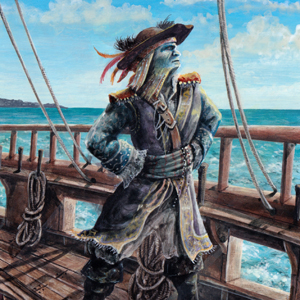 This image depicts altered art for Yuriko, the Tiger's Shadow, from Magic: the Gathering. A black silhouette against a pale, paint-swirled background, shows Yuriko staring out pensively over the still waters of the sea, surrounded by a streaked black circle symbolizing the rising sun.